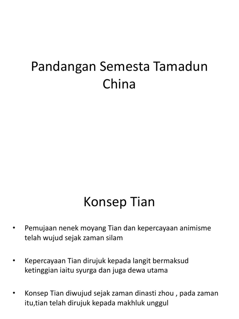 Holistik di sini bermakna suatu pandangan. Konsep tian atau langit sebagai makhluk yang unggul yang menguasai nasib seseorang telah wujud sejak dinasti zhou. Interaksi antara pelbagai tamadun (melayu, china dan india): Perbezaan dan persamaan tamadun islam dan barat. · satu konsep mengenai alam semesta secara keseluruhan.