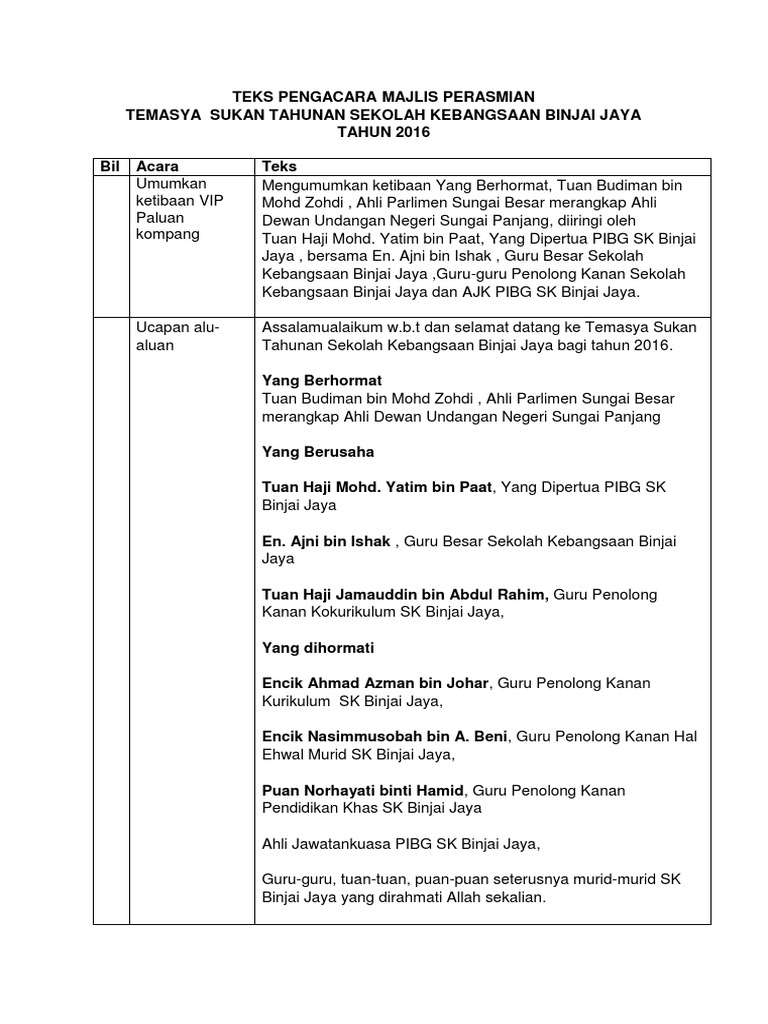 3 from Yusnita bt abd rahman selaku pengerusi kelab staf. Teks majlis kuarter master teks ucapan majlis kuarter master. Search everywhere only in this topic. This page is about teks ucapan pengerusi majlis,contains teks ucapan pengacara majlis perasmian,teks ucapan pengacara majlis sambutan hari raya 2015a.doc,home majlis design joy studio design gallery,teks ucapan perasmian futsal 2011 and more. Para tetamu, guru dan pelajar sekalian, majlis persaraan pegawai pendidikan merupakan sebahagian tatacara operasi piawai atau s.o.p. Masuk ke perkarangan majlis, para hadirin diminta untuk berdiri. 0 ratings0% found this document useful (0 votes). Teks ucapandatuk haji hajiji haji noor,menteri kerajaan tempatan dan perumahan sempena meraikan majlisperpisahan puan p.s.
