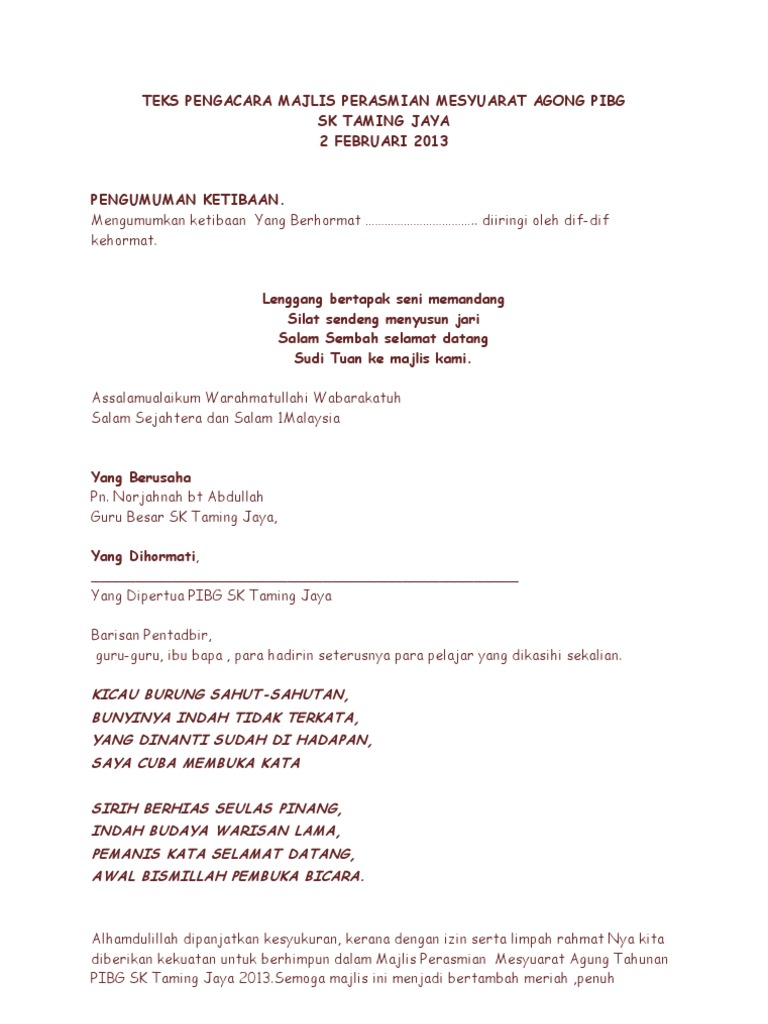 Teks Ucapan Majlis Perasmian Surau from imgv2-1-f.scribdassets.com Assalamualaikum w.r.b.t dan selamat pagi. Draf ucapan perasmian majlis anugerah cemerlang dan mesyuarat agung pibg smk cheras jaya tahun 2009. Teks ucapan majlis penyerahan slip keputusan spm 2015. Bersyukur saya ke hadrat allah s.w.t kerana dengan limpah kurnianya dapatlah saya sekeluarga melaksanakan majlis perkahwinan anak saya.dengan pasangannya. .teks pengacara majlis perasmian penutupan program teks ucapan institutional repository teks ucapan pengacara majlis mesyuarat agung tahunan koleksi teks ucapan untuk pelbagai majlis sekolah tetamu istimewa teks pengacara majlis majlis. Teks ucapan majlis perasmian bulan bahasa. Contoh teks ucapan pengacara majlis sempena hari guru. Teks ucapan majlis persaraan mp3 & mp4.