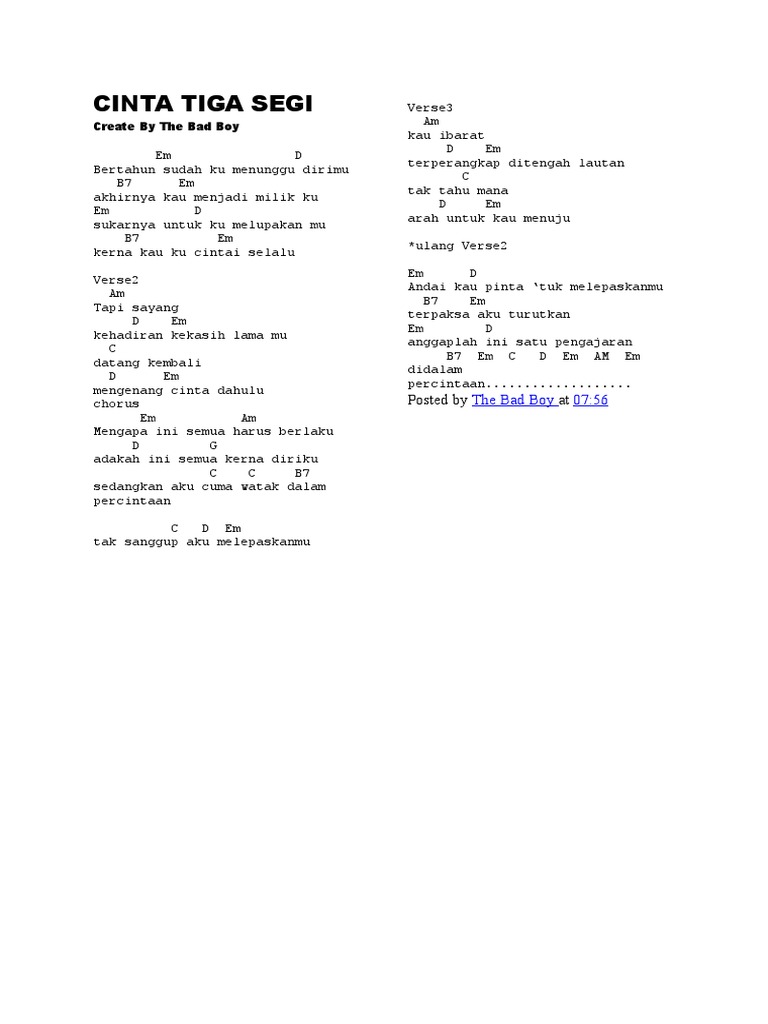 Cinta tiga segi upload >>samiera_putrie. Thank you for making our chords catalog better. Create by the bad boy. Bertahun sudah ku menunggu diri mu akhirnya kau menjadi milikku sukarnya untuk ku melupakan mu kerna kau ku cintai selalu. Akhirnya kau menjadi milik ku.